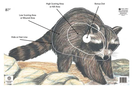 2.4 The high scoring area of Group No. 3 (plus or minus 1/8”) is 4 ¼ inches wide by 6 ¾ inches long with rounded ends. Targets in this group are the coyote, raccoon, javelina, turkey, fox, goose, wildcat, and pheasant. A bonus 3.5 cm dot (valued one point) is located in the middle of the high scoring area and colored white on dark targets and black on light targets.